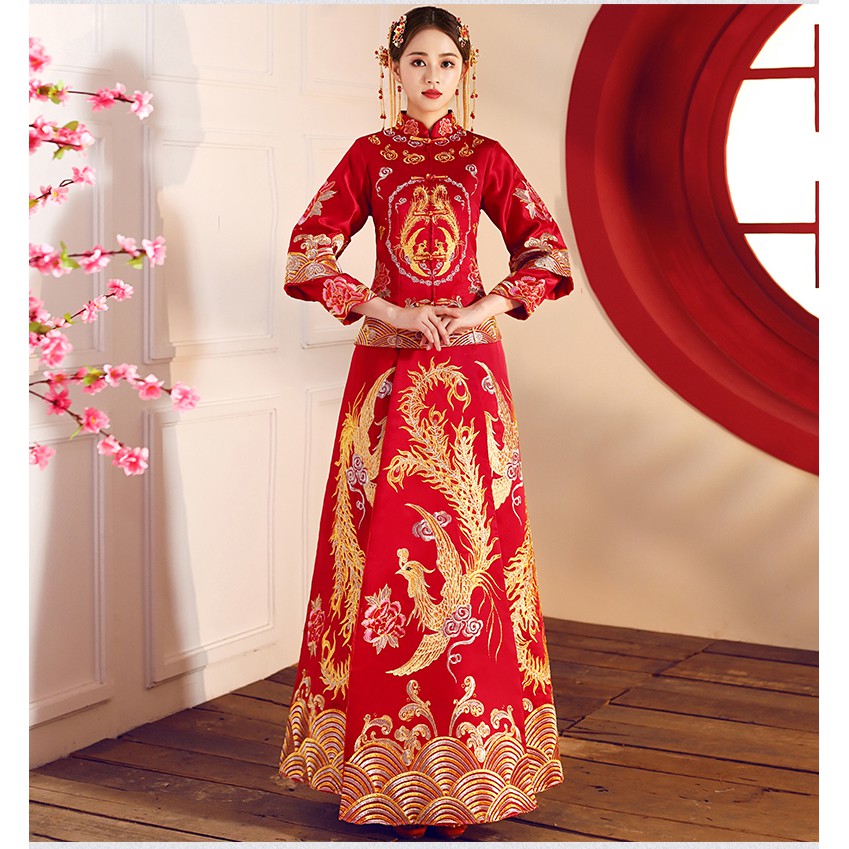 Chinese bridal qipao phoenix patterned wedding gown wanita gaun baju kurung.